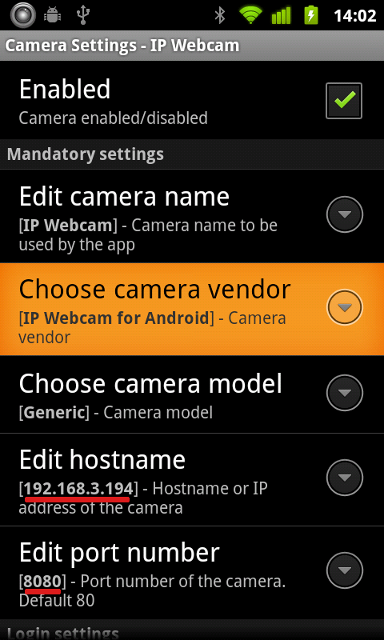 Для использования IP Webcam выберите "MJPEG Stream" из списка производителей и используйте данные настройки: